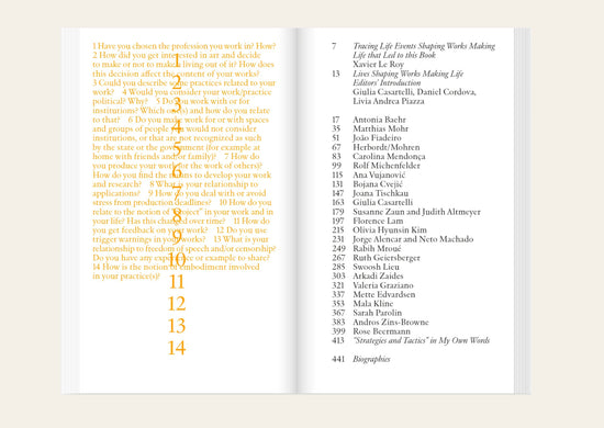 "Lives Shaping Works Making Life" is a collection of 24 transcribed public conversations titled Practices: Strategies and Tactics, led by Xavier Le Roy and hosted by the Institute for Applied Theater Studies in Giessen between November 2022 and November 2024. These dialogues bring together artists, cultural workers, and curators, creating a space where Xavier Le Roy engages in conversation with each guest.